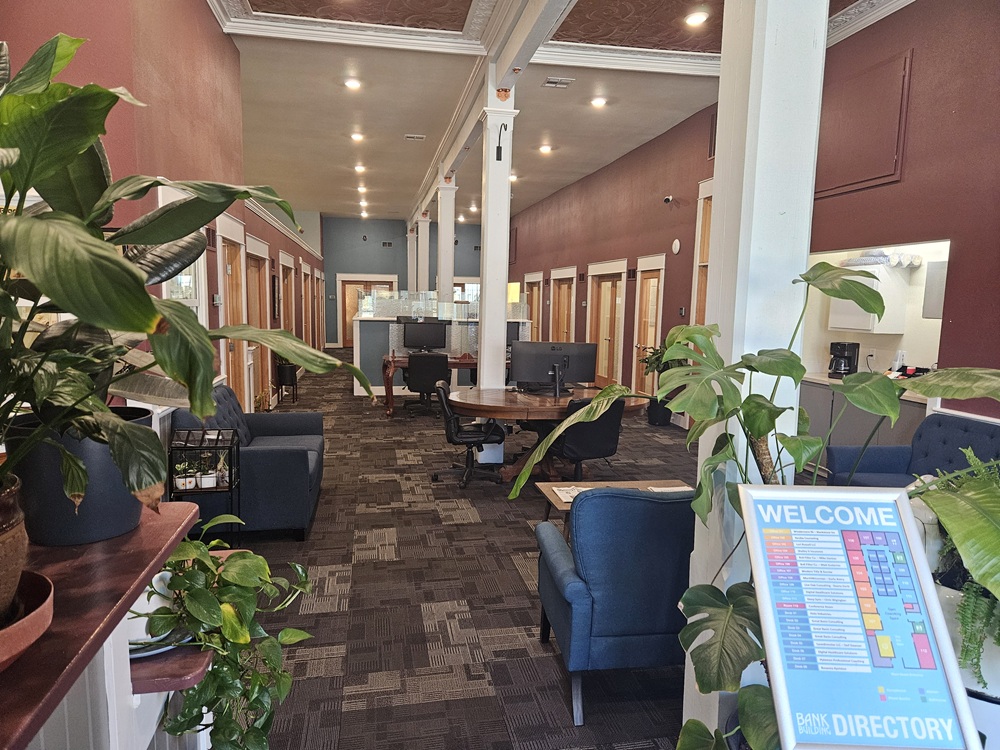 The Bank Building Offices are in the newly restored 1904 Bank Building. The downtown environment has a nice balance of urban energy and small-town charm. Inside, the 13-foot ceilings and historic moldings have a very classy and professional atmosphere.